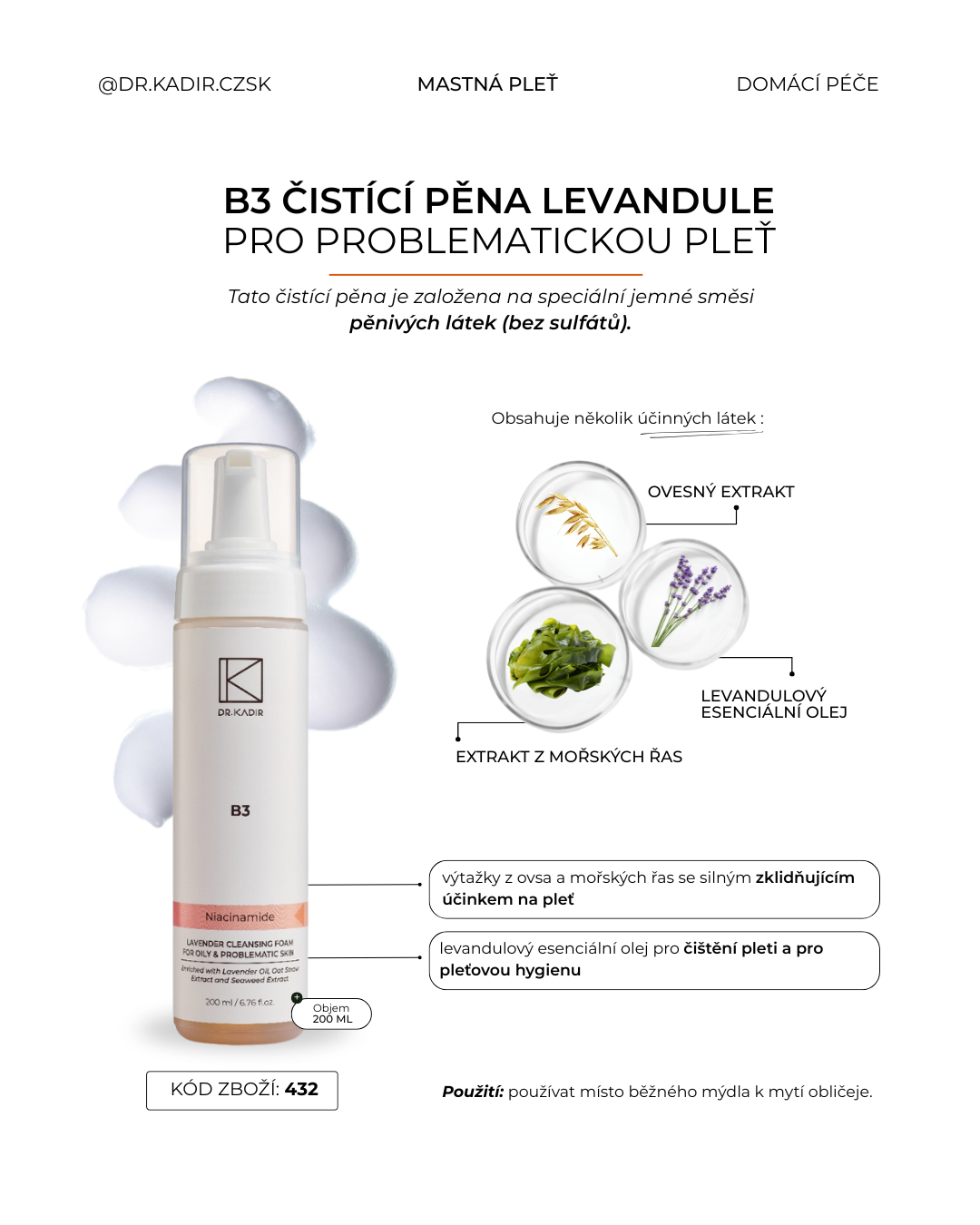 Tato čistící pěna je založena na speciální jemné směsi pěnivých látek (bez sulfátů). Obsahuje několik účinných látek pro zklidnění pleti a zachování pleťové hygieny: výtažky z ovsa a mořských řas se silným zklidňujícím účinkem na pleť, levandulový esenciální olej pro čištění pleti a pro pleťovou hygienu.