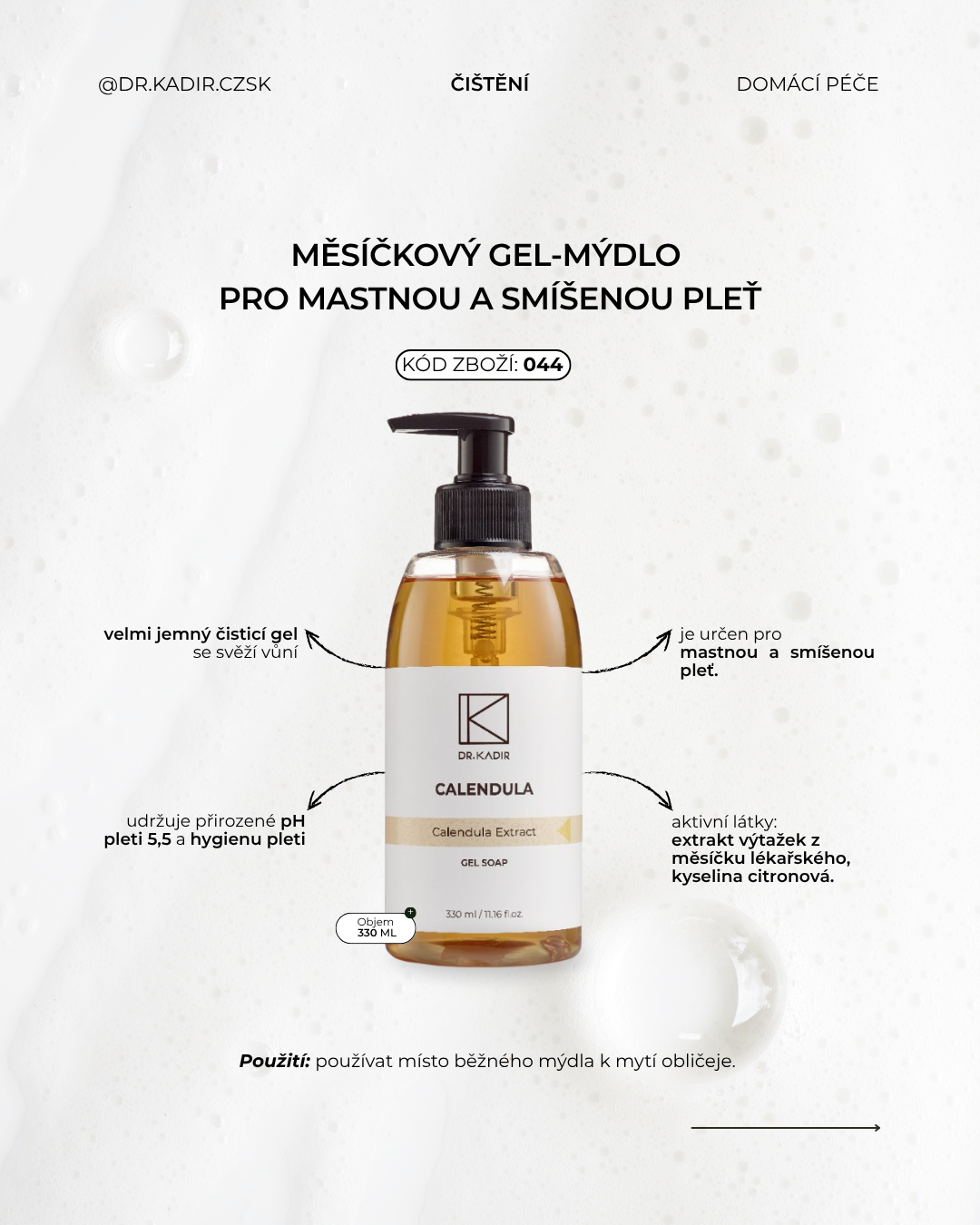 Použití: používat místo běžného mýdla k mytí obličeje.